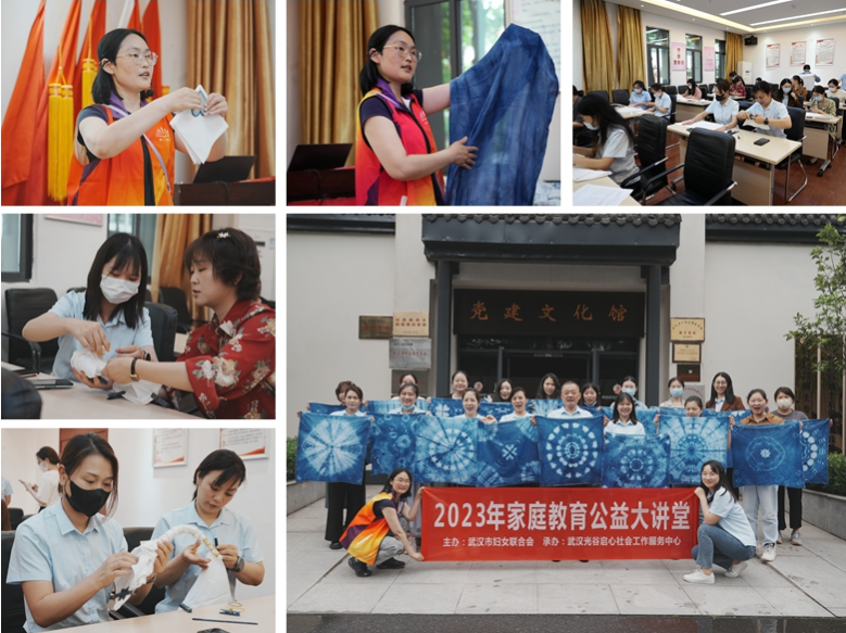 本次活動邀請武漢光谷啟心社會工作服務中心老師進行指導。活動開始,老師向大家介紹了扎染的歷史與傳承,隨后老師現場演示幾種扎染花紋的扎節方式以及操作技巧,扎節時松、緊、疏、密的不同,使得扎染成品花色圖案千差萬別,絢麗多姿。隨后,參會人員紛紛發揮著自己的想象力創造力,扎染出屬于自己獨一無二的花紋。
